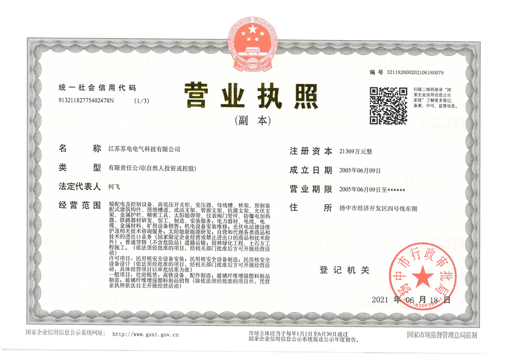 江蘇蘇電電氣科技有限公司是一家集制造、經(jīng)營(yíng)、服務(wù)于一體的綜合性企業(yè)。成立于2005年6月9日,注冊(cè)資金21369萬元,現(xiàn)有職工186人,其中高級(jí)工程師3人 ,工程師15人,各類專業(yè)技術(shù)人員28人,年銷售額3億多,是揚(yáng)中市開發(fā)區(qū)三十強(qiáng)企業(yè)之一。 公司立足于電器領(lǐng)域,形成了多元化的發(fā)展格局。憑借優(yōu)秀的團(tuán)隊(duì)、精良的設(shè)備、優(yōu)勢(shì)的技術(shù)和高效的管理,專業(yè)生產(chǎn)高低壓開關(guān)柜、母線槽、抗震支架、管廊支架、成品支架、光伏支架、電纜橋架等。在供配電、大型建筑、市政工程、光伏發(fā)電等領(lǐng)域享有較有高的聲譽(yù)。 公司秉承“求實(shí)、創(chuàng)新、和諧、共贏”的發(fā)展主題,進(jìn)行了一系列變革,優(yōu)化資源配置,搭建了高效發(fā)展的平臺(tái)。公司較早地采用了CAD電腦輔助系統(tǒng),擁有數(shù)控加工中心。產(chǎn)品被青島新機(jī)場(chǎng)、江蘇省電力公司、湖北省電力公... ...