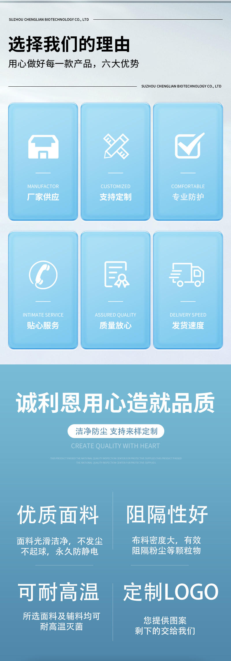 產品性能:具有舒適性、潔凈性、阻隔性、透氣性、耐濕熱滅菌、防靜電、及耐久性,穿著柔軟舒適