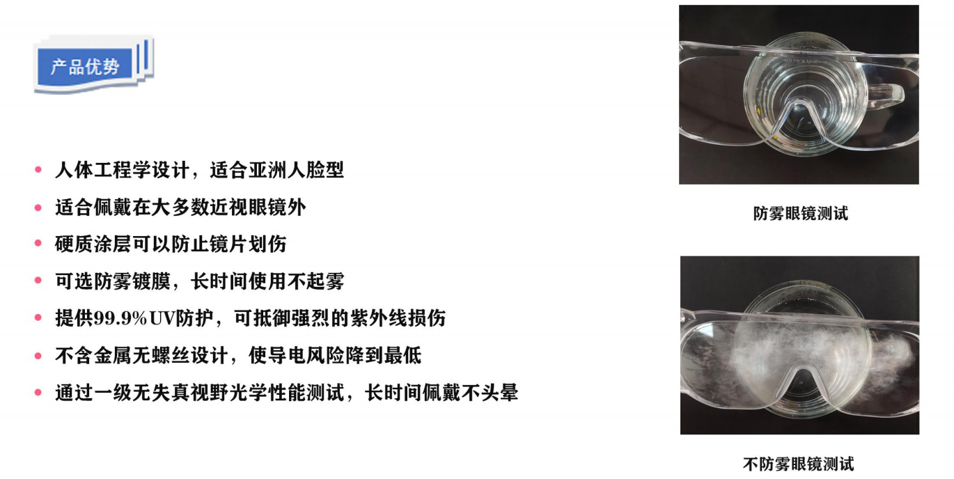 產(chǎn)品性能:防飛濺不起霧、防沖擊、防塵、材質(zhì)輕盈,不壓鼻梁