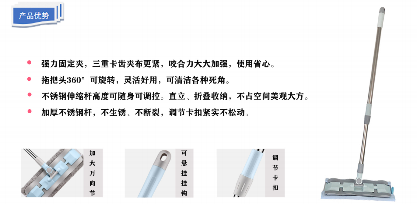 產品性能:360°靈活旋轉、不生銹、不斷裂、折疊收納不占空間、拖布吸水吸塵、抗污、不脫落纖維